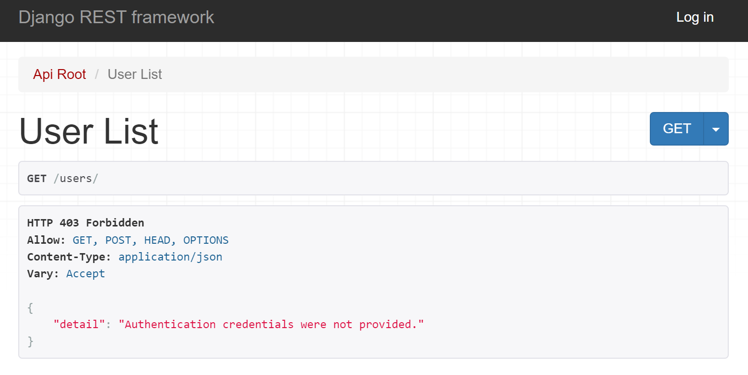 처음 이러한 화면이 나오는데 이는 DRF의 기본적인 보안 기능으로 권한이 없다는 것을 말해줍니다